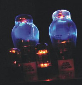 Jetzt ist die Frage, wozu die ganze alte Technik, wenn man Transistoren weder Heizen, noch mit hoher Spannung betreiben kann und keinen AÜ braucht. Viele Leute, so auch ich, sind der Überzeugung, dass Röhren einen besseren Sound haben. Viele sagen das Gegenteil. Hier muss jeder seine eigene Meinung gelten lassen. Was den Röhrenverstärker aber ganz klar vom Transistorverstärker absetzt, ist das schön ”warme” Glühen der Röhre. |