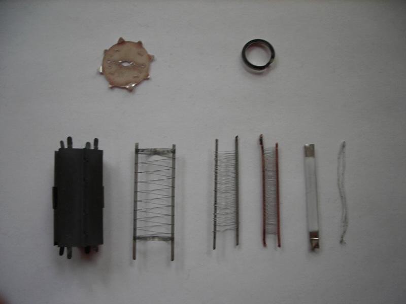 Unten links die Anode. Daneben das grobmaschige Bremsgitter. Dann g2, g1, die beschichtete (weiss) Kathode und schließlich ganz rechts der Heizdraht.