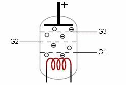 Zwischen Gitter (g1) und Anoden zog man noch zwei Gitter ein. Das Schirmgitter (g2) sowie das Bremsgitter (g3). Dabei wird das Schirmgitter an eine Positive Spannung gelegt. Durch die Anode sowie durch das Schirmgitter fließt ein Strom (beide auf Positiver Ladung). Um es einfach auszudrücken kann man sagen: Dass Schirmgitter schirmt schief fliegende Elektroden von der Anode ab und wirkt Verzerrungen entgegen. Durch dieses zusaätzliche Gitter entstand die Tetrode. Durch dieses gitter (g2) trafen die Elektroden unglaublich schnell auf das Anodenblech auf und es gab eine Elektrodenwolke um die Anode, da die Elektroden nicht schnell genug in die Bleche eindringen konnten. Also kam noch das grobmaschige Bremsgitter (g3) dazu. Es wird an Kathodenpotential gelegt und ist somit negativ geladen. Es bremst die Elektroden vor dem auftreffen auf die Anodenbleche stark ab.