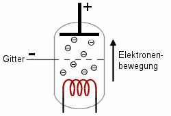 Damit man den Elektronenfluss steuern kann, ist um die Kathode spiralförmig ein Faden gewickelt. Natürlich mit Abstand. Mit diesem Faden regelt man den Elektronenfluss. Praktisch wie ein Sieb kann es mit Strom geöffnet oder verengt werden. Der Faden bewegt sich natürlich dabei nicht. Diesen zusätzlichen Faden nennt man Gitter. Hier haben wir die zweite Art von Röhre. Die Triode. Das Gitter wird dabei mit negativer Spannung gesteuert. Durch die gleiche Polung der Elektroden von der Kathode kommend und dem Gitter, stößt das Gitter die Elektroden in Richtung Kathode zurück und nur einige gelangen vorbei.