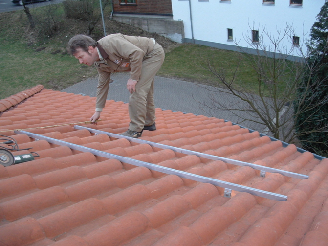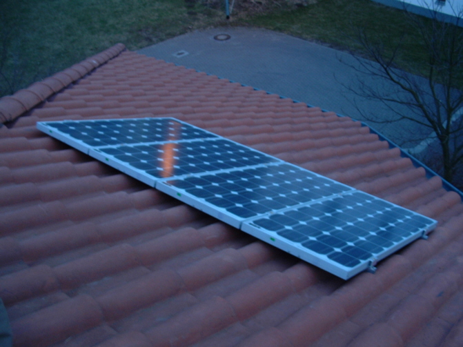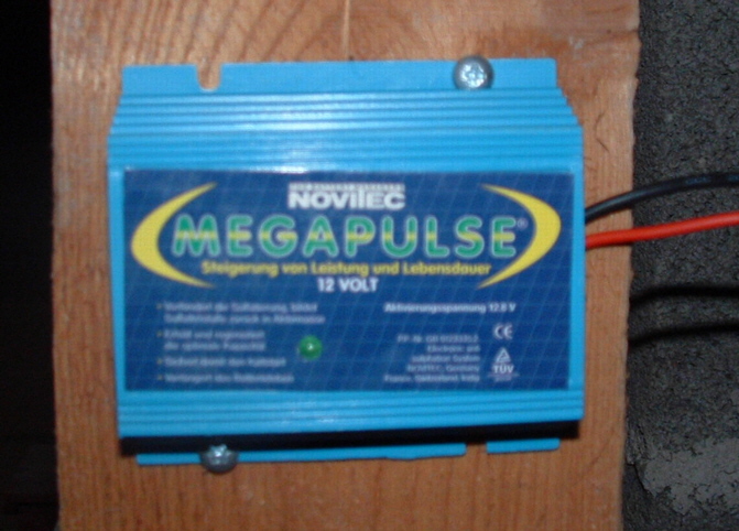 Danach wird mit der Planung der Elektrik begonnen. Die vom Dach kommenden Kabel werden in einer Sammelstelle auf eine Leitung geklemmt, in der alle Solarmodule parallel geschaltet sind. Das bedeutet gleichbleibende Spannung, aber höhere Ströme. In diesem Fall kommen von den Solarmodulen 17 Volt und 18 Ampere. Dieses Kabel sollte einen Querschnitt von mindestens 3,0 mm² haben. Je Grösser der Querschnitt, desto weniger Leitungsverluste. Wenn kein guter Platz für die Batterien gefunden wird, sollte man sie, da Diese gasen, auf den Dachboden stellen. Der einzige Nachteil ist, dass man im Winter keine sehr starke Leistung aus den Batterien holen kann. Ein Megapulse der Firma Novitec soll die Leistung kalter Batterien erhöhen und gleichzeitig durch Impulse die Sulfatbildung in der Batterie verhindern. Dieses Gerät kostet in etwa 70 Euro. Ich habe eins eingebaut, ob es was bringt stellt sich noch heraus !