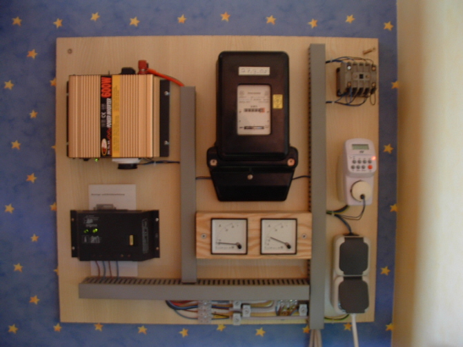 Die Batteriegrösse ist abhängig von der benötigten Leistung und der Grösse des Wechselrichters. Die Leitung von der Batterie zum Wechselrichter müssen ebenfalls einen sehr grossen Querschnitt haben. Hier empfiehlt sich bei einem 600 Watt Wechselrichter ein Querschnitt von 7,5 mm². Am besten nimmt man einfach normales NYM 5x1,5 Installationsleitung und klemmt alle 5 Adern zusammen. So ergibt sich ein Querschnitt von 7,5 mm². Sind diese Leitungen alle verlegt, kann man sich an eine Schaltung machen, mit der die ganze Technik gesteuert und überwacht wird. Wichtig bei der Verwendung von normalen Autobatterien ist, dass der Laderegler in der Nähe der Batterien plaziert werden muss, da er ständig die Temperatur der Batterien überwacht. Bei Verwendung eines Ladereglers ohne diese Schutzfunktion, oder wenn die Batterien 20 mal so viel Kapazität haben wie der Ladestrom beträgt, kann man den Laderegler auch ausserhalb der Batterien plazieren. Die hier verwendete Schaltung ist selbst ausgedacht und beinhaltet den Wechselrichter, Laderegler, Stromzähler, 2 Amperemeter für Lade- (rechts im Bild) und Laststrom (links im Bild) der Batterien, eine Steckdose die vom Wechselrichter kommt und eine Steckdose, die mit einer Zeitschaltuhr und einem Schütz zwischen Netz und Wechselrichterbetrieb umgeschaltet werden kann.