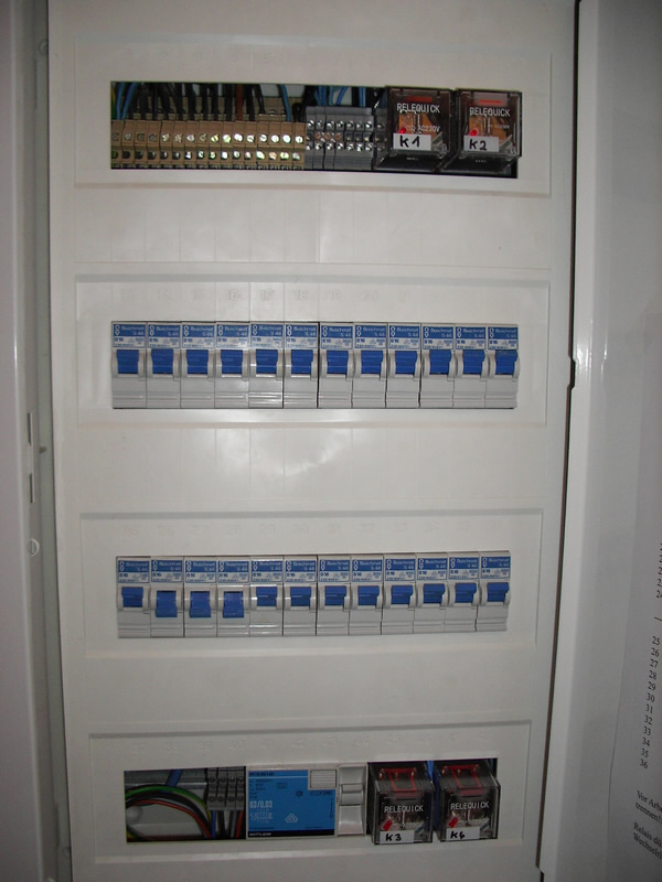 K1 und K2 sind Koppelrelais mit Stecksockel und je 4 Umschaltern. Die Kontaktbelastbarkeit liegt bei 10A je Umschalter. Es sind pro Relais immer zwei zusammengefasst, was 20A Umschaltlast bereitstellt. Die Relaisspulen sind direkt mit dem Wechselrichterkreis verbunden. Sprich, wenn der Wechselrichter läuft sind die Relais angezogen, wenn nicht dann nicht (logisch oder? =) Der Wechselrichter hat (leider) für unsere Zwecke ungeeignet einen Soft-Start. Durch das langsamen Hochfahren der Ausgangsspannung spinnen die Relais, und die FI-Schalter am Wechselrichter und am Netz fliegen durch. Dafür ist das Zeitrelais (ihr könnt euch erinnern) auf dem Dachboden. Dies schaltet erst nach 3 Sekunden ein. Nach dieser Zeit ist der Wechselrichter komplett hochgefahren und die Relais ziehen sofort an. Aufgrund ungleicher Phasenlage zwischen Netz und Wechselrichter kann es passieren, dass der Leistungsschutzschalter beim umschalten am WR rausfliegt. Daher werde ich noch ein Zeitrelais montieren, was die beiden Relais in der Unterverteilung nacheinander anziehen lässt. Damit sollte dies behoben werden.