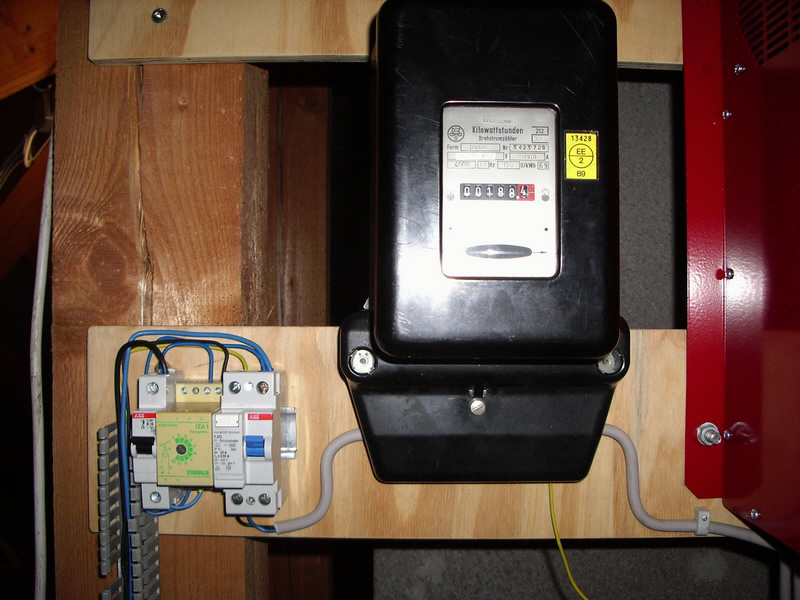 Neben dem Wechselrichter sehen wir noch den Stromzähler, sowie FI-Schutzschalter, Leistungsschutzschalter und ein einschalverzögertes Zeit-Relais. Da die Wechselrichter am Ausgang dauerkurzschlussfest sind MUSS unbedingt diese Sicherungpalette DIREKT hinter dem Wechselrichter angebracht werden. Die Umschaltung zwischen Netz und Solarstrom erfolgt direkt in der Unterverteilung. Dazu gleich mehr.
